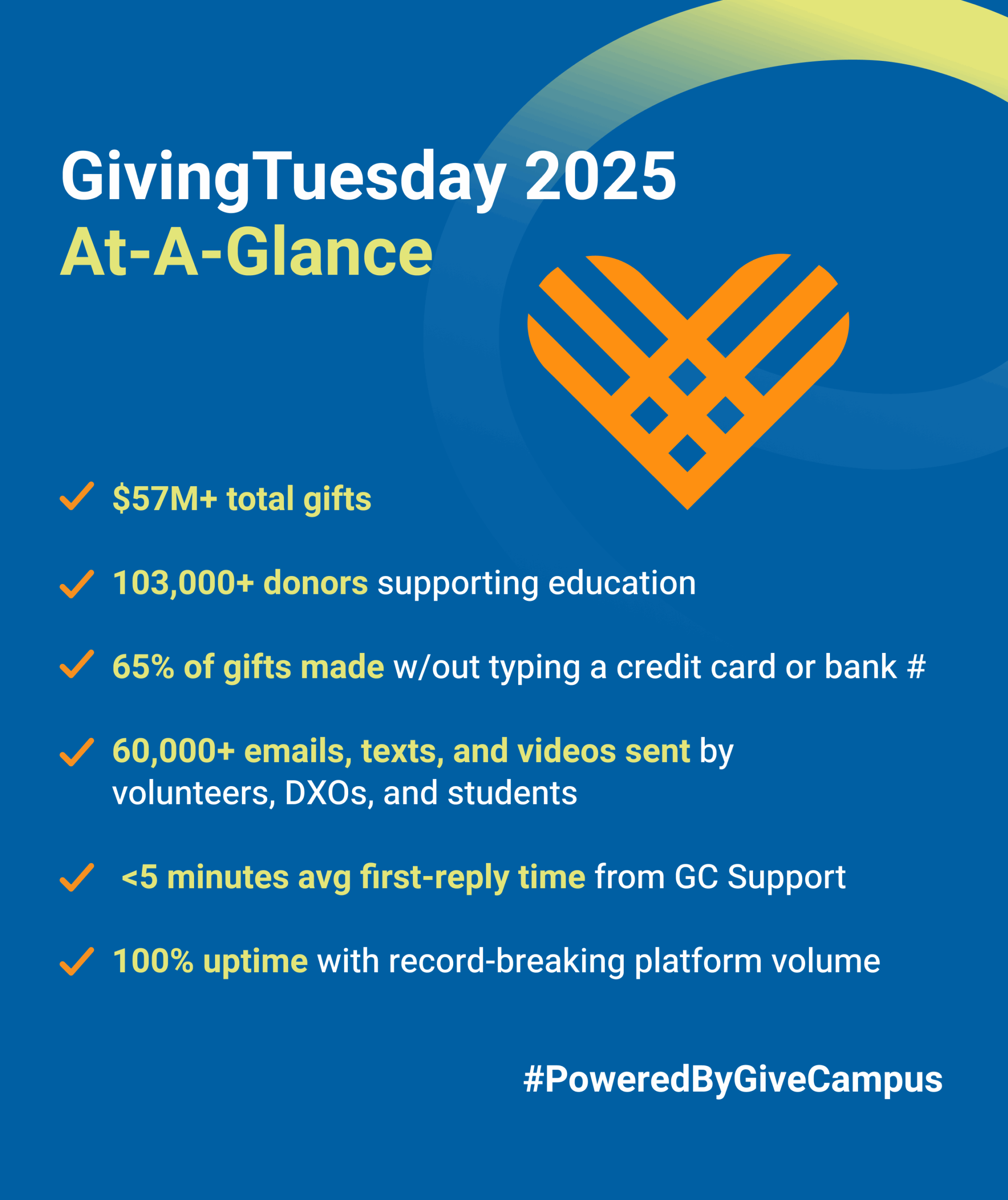 Behind the scenes, the GiveCampus platform remained dependable throughout the day, maintaining 100 percent uptime even as traffic set new all-time records. Our nimble Support team responded to partner inquiries quickly, with an average first-reply time of under five minutes. While these operational details often go unnoticed, they helped ensure that Partner institutions could stay focused on engaging donors rather than troubleshooting technology.